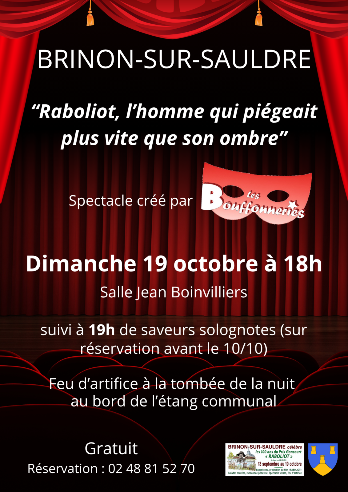 Le 19 octobre, la troupe Les Bouffonneries propose un spectacle vivant « L’homme qui piégeait plus vite que son ombre » suivi de saveurs solognotes et pour finir en beauté, un feu d’artifice au bord de l’étang.