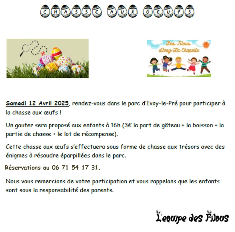 L'association des parents d'élèves "Les Filous d'Ivoy / La Chapelle" propose une chasse aux œufs sur inscription le samedi 12 avril dans le parc d'Ivoy-le-Pré à 16h00.