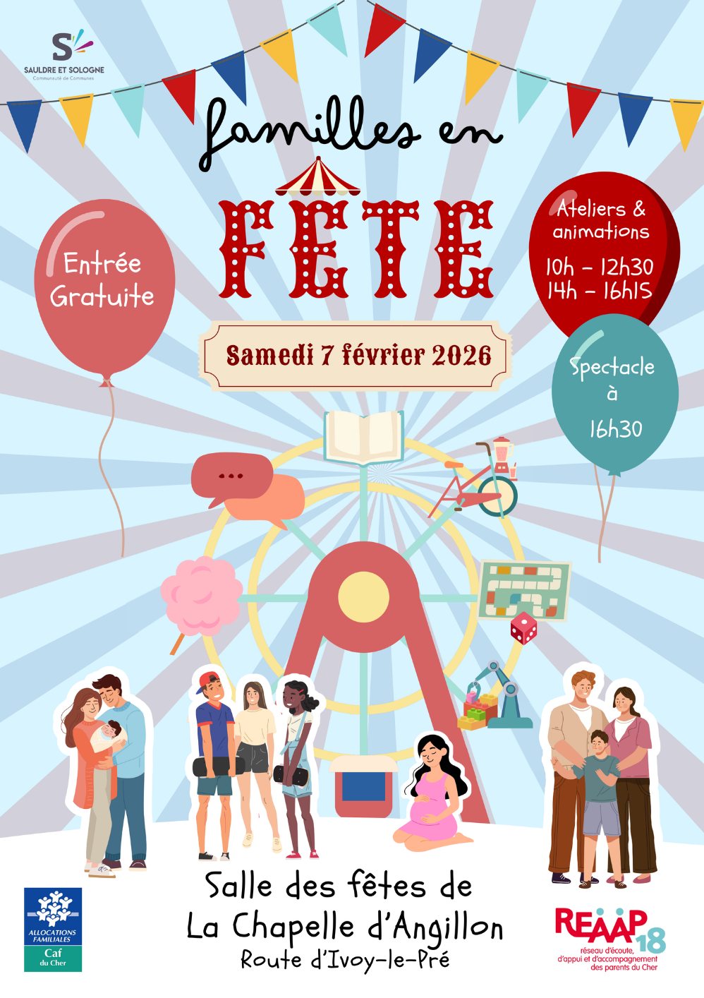 Familles en fête transforme la salle des fêtes de La Chapelle-d’Angillon en véritable terrain de jeux et de découvertes pour petits et grands. Ateliers ludiques, animations conviviales et temps de partage rythment la journée, avant de se retrouver tous ensemble autour d’un spectacle festif. Une parenthèse joyeuse, gratuite et ouverte à tous, pour se rencontrer, s’amuser et célébrer la famille sous toutes ses formes.