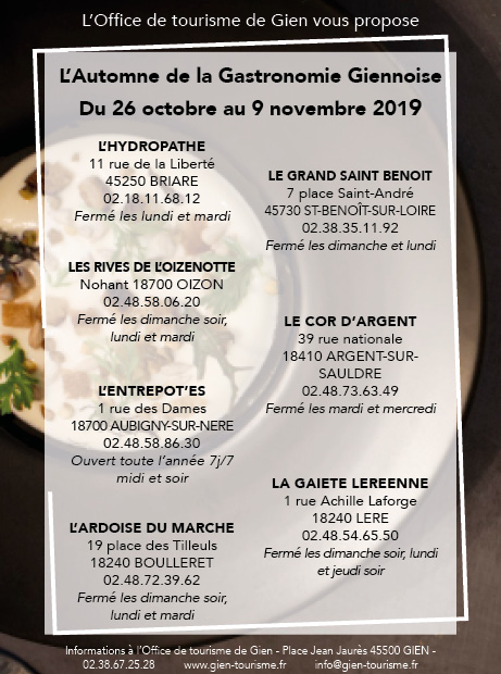 L'Automne de la Gastronomie Giennoise c'est faire découvrir la gastronomie régionale et locale. Ils auront des menus spéciaux aux prix abordables.
