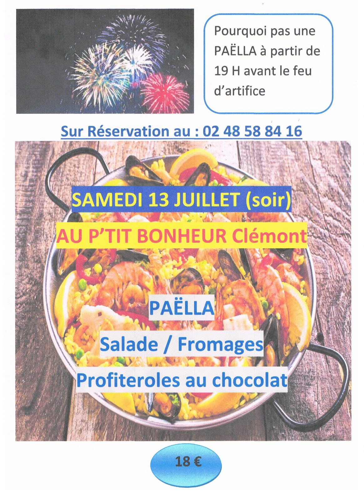 Paëlla au restaurant Au P'tit Bonheur et feu d'artifice à 19h