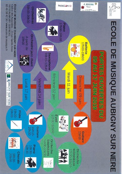 Portes ouvertes école de musique d'Aubigny-sur-Nère : guitare, batterie, éveil, orchestre intermezzo, orchestre sourissons, orchestre jazz chant, piano, saxophone, flûte, chorale...