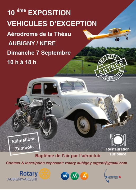 The Rotary Club Aubigny-Argent welcomes you to the Théau aerodrome for the 9th exhibition of prestige and classic vehicles.