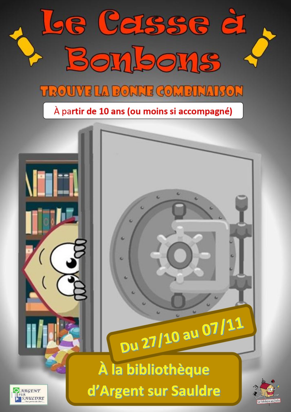 To find the combination to the safe, he challenges the public at the Argent sur Sauldre library to come and try their hand at a new puzzle game: "Le casse à bonbons".