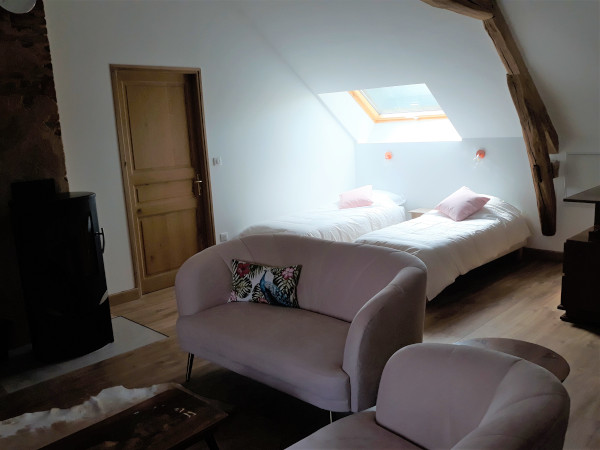 On the second floor of a 19th-century maison de maître, at the entrance to the Cité des Stuarts, this spacious and comfortable apartment has been tastefully decorated. Ideal for two couples or a couple with 2 children (2 x 160cm beds). You'll have access to the owners' large garden and swimming pool. It comprises: a very large living room with fully-equipped kitchen, dining room, lounge and sleeping area, as well as a large bedroom with bathroom. Separate wc. Hiking and mountain-biking trails from the gîte, bicycles for hire. In summer, free-access swimming pool and 1 free SPA session per stay. In winter, 1 complimentary sauna session for stays of 3 nights or more, with optional "organic" breakfasts, table d'hôtes, New Year's Eve, Valentine's Day...SPA and sauna not included:18 euros