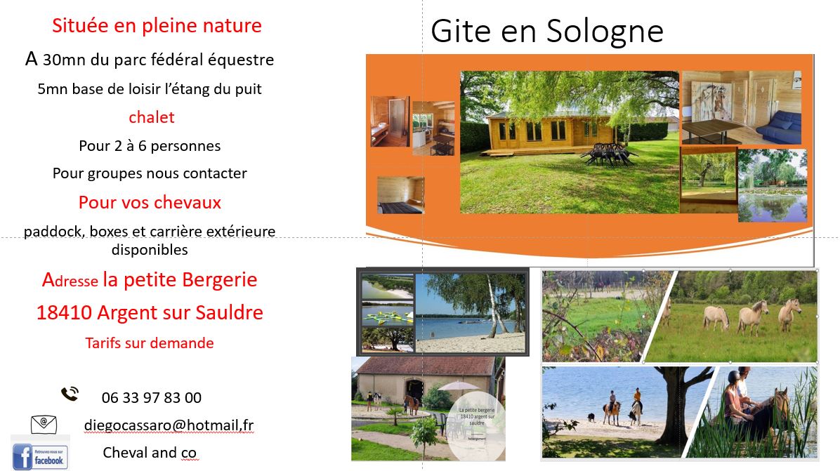 Gîte équestre situé en pleine nature , un chalet de 2 à 6 personnes - Découvrez Cheval and Co et son Gîte en Sologne à Argent-sur-Sauldre, un gîte accueillant jusqu'à 6 personnes, niché en Sologne. Les animaux sont acceptés.