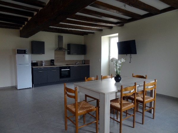 80 m² : "Côté Parc" est un des 3 gîtes aménagé de façon contemporaine dans cette très ancienne maison de ferme sur une grande propriété forestière avec étang (pêche possible) - Espace privatif avec salon de jardin et barbecue - Local vélos - RdC : grande pièce à vivre avec espace salon (convertible 180 haut de gamme) et cuisine intégrée (micro-ondes, congélateur) - wc - Buanderie - 1er étage : 2 chambres (1 lit 140 - 2 lits 90) - salle d'eau - wc - Chauffage électrique - Possibilité lit et chaise bébé - Chats et petits chiens acceptés sur demande - Le prix comprend les lits faits à l'arrivée.