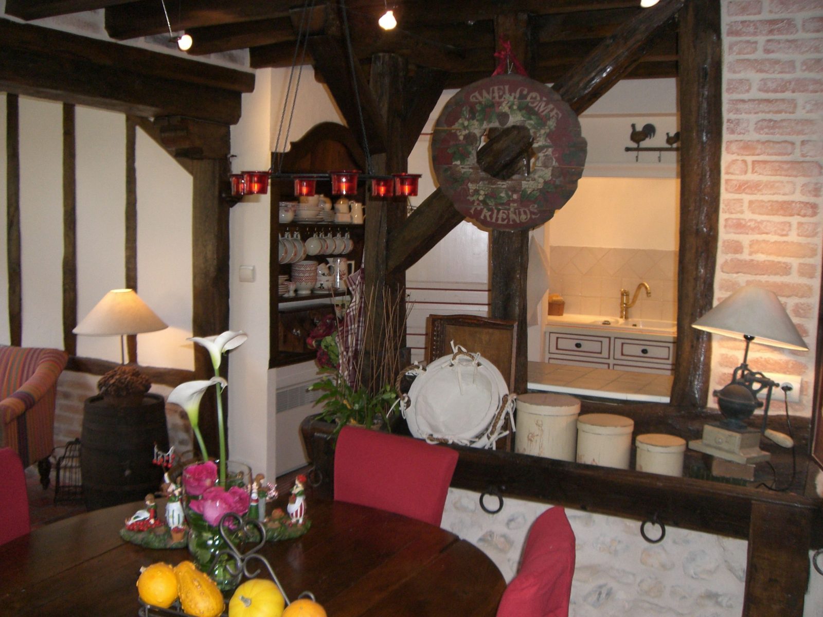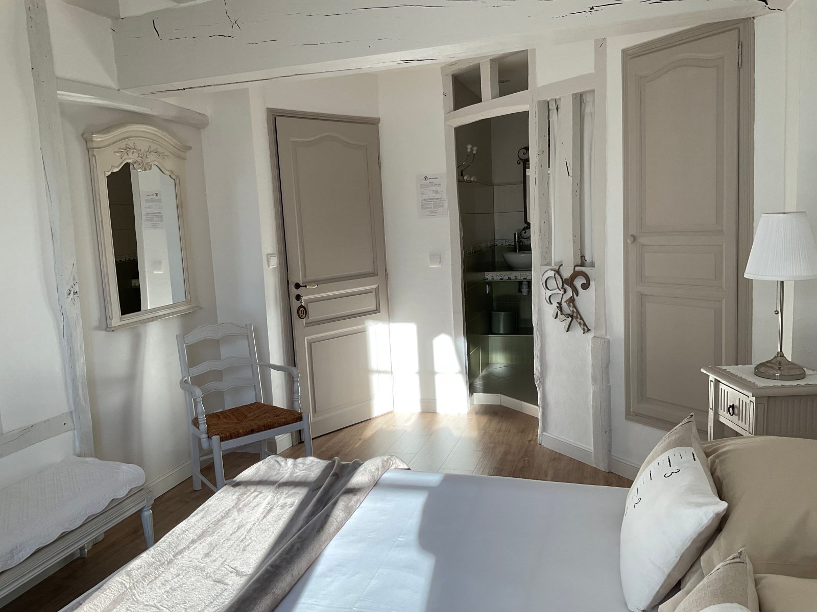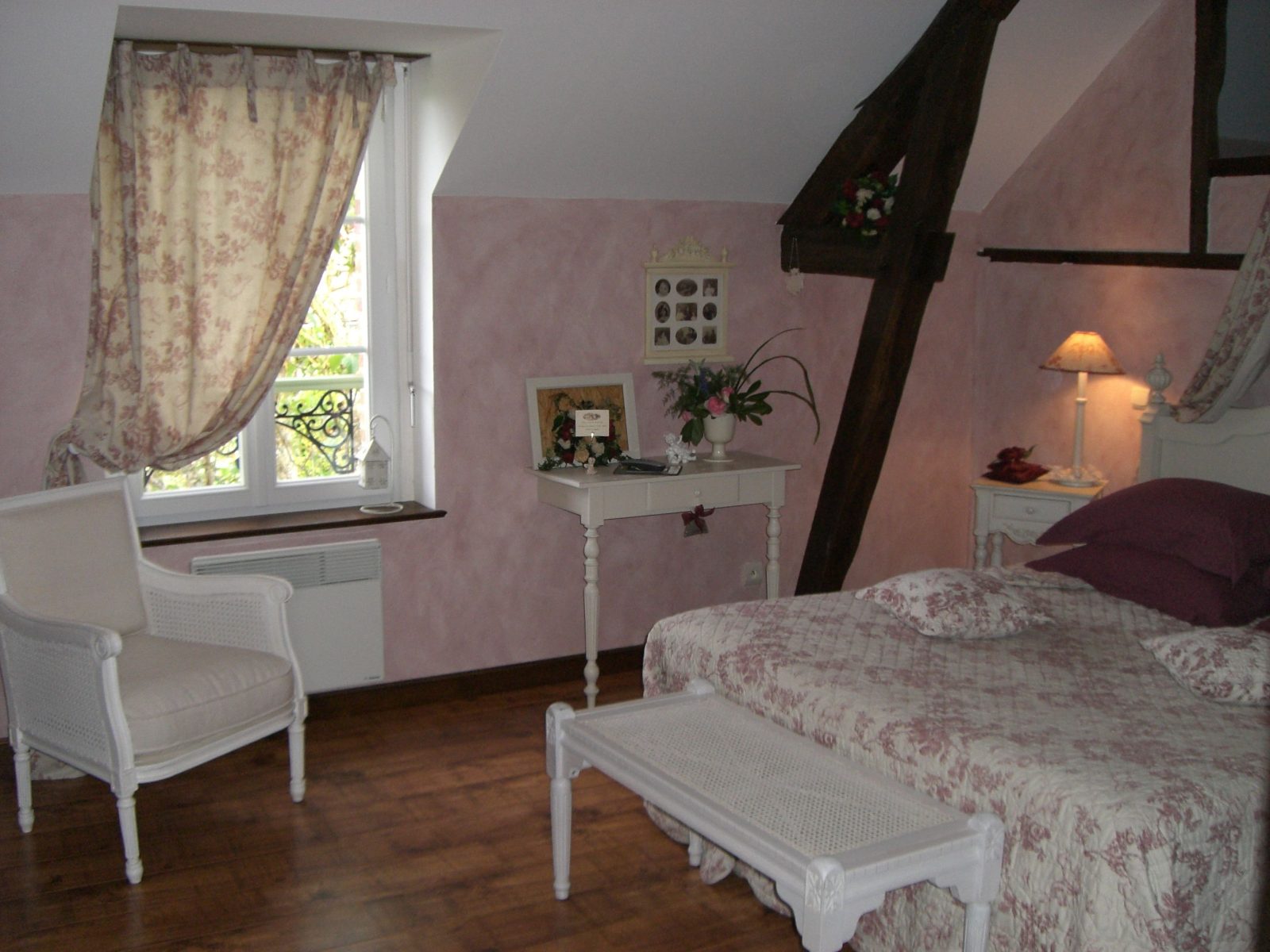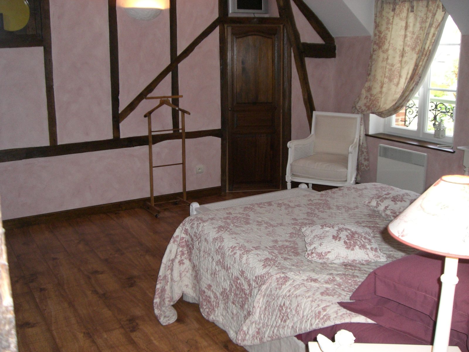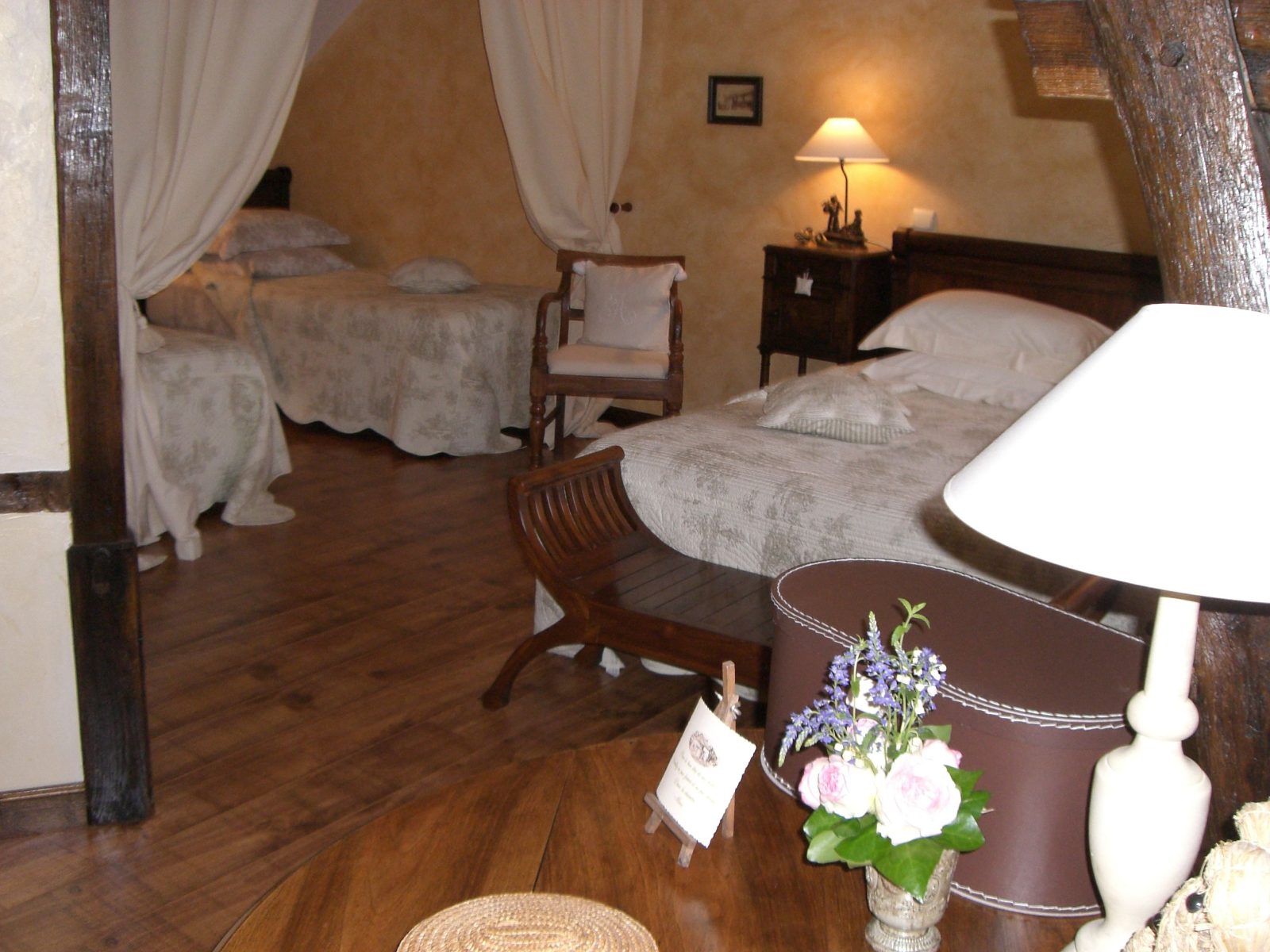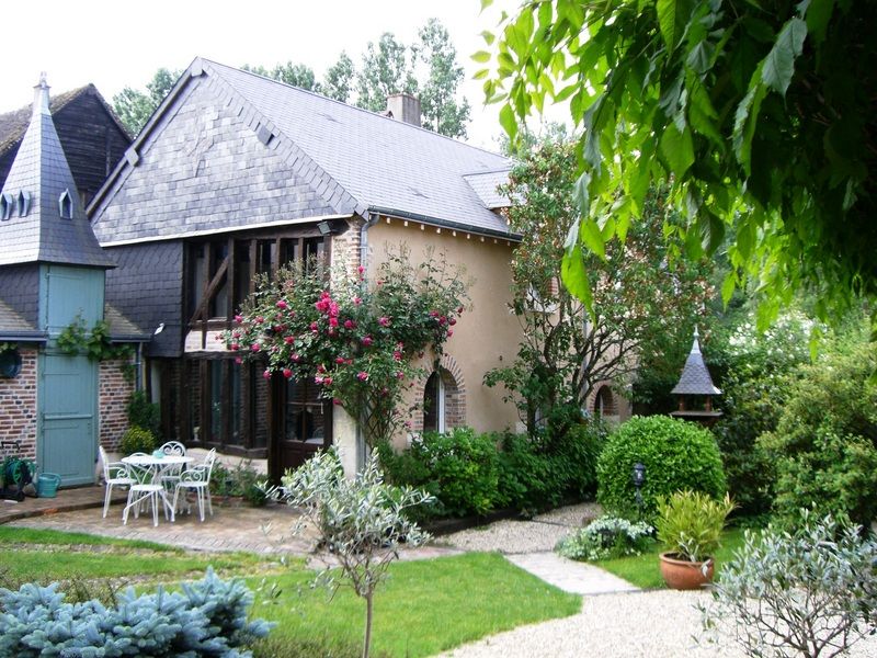 En centre-ville, à 50 m du château, dans une ancienne grange à pans de bois - Au 1er étage : 1 ch. 3 pers et 1 ch. 4 pers avec coin salon (lits 160 et 90), d'accès indépendant, toutes avec salle d'eau/wc - Au rdc : 1 ch. 2 pers (lit 160) avec salle d'eau/wc - Salle des petits déjeuners/salon réservé aux hôtes - Beau jardin arboré et fleuri avec espaces salons