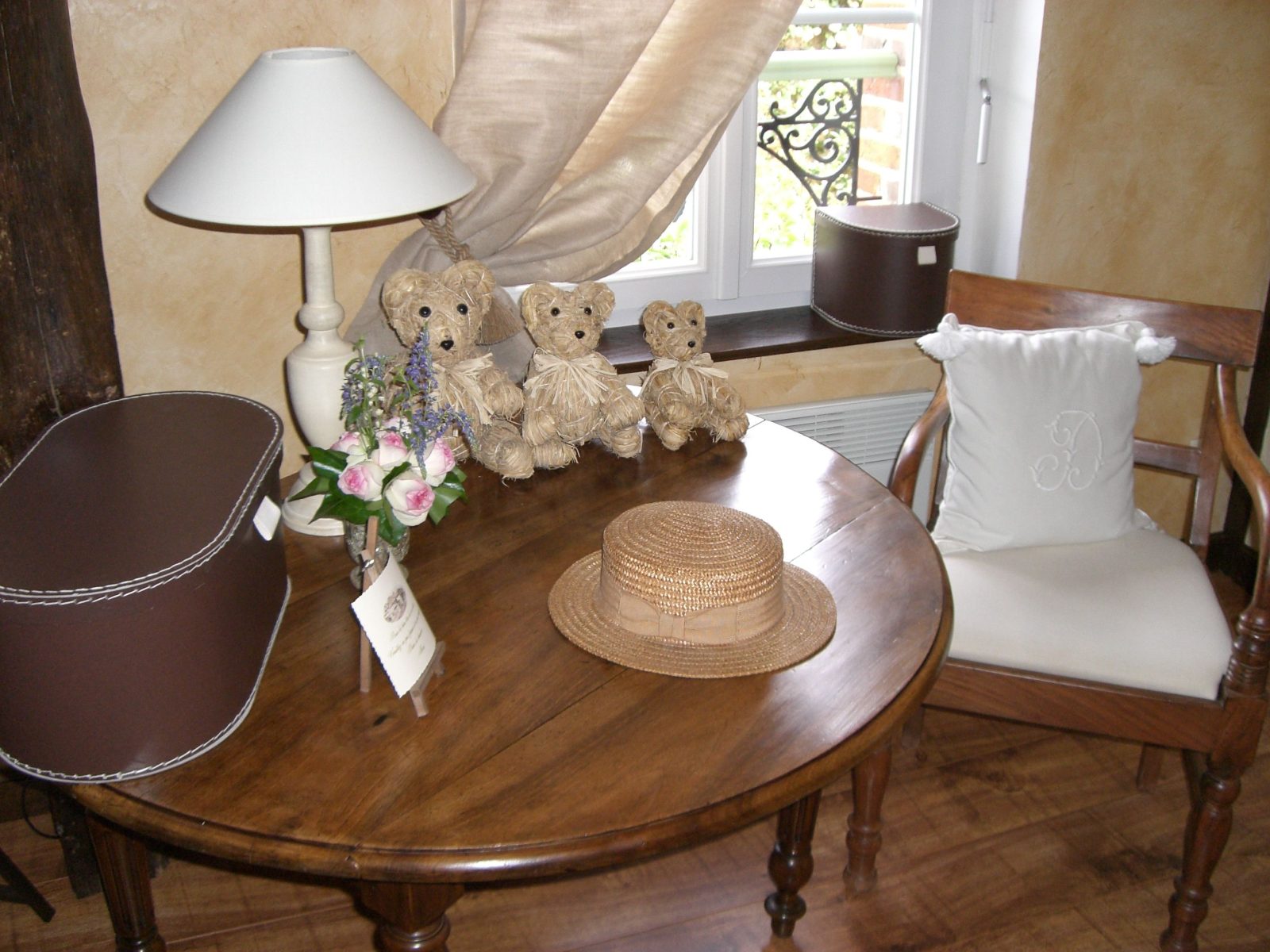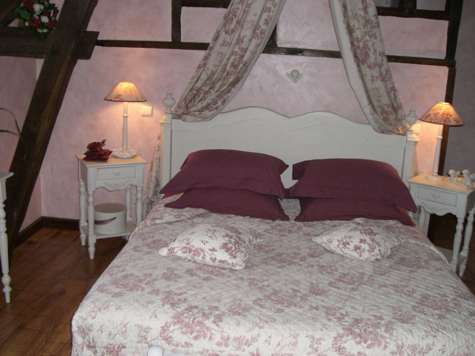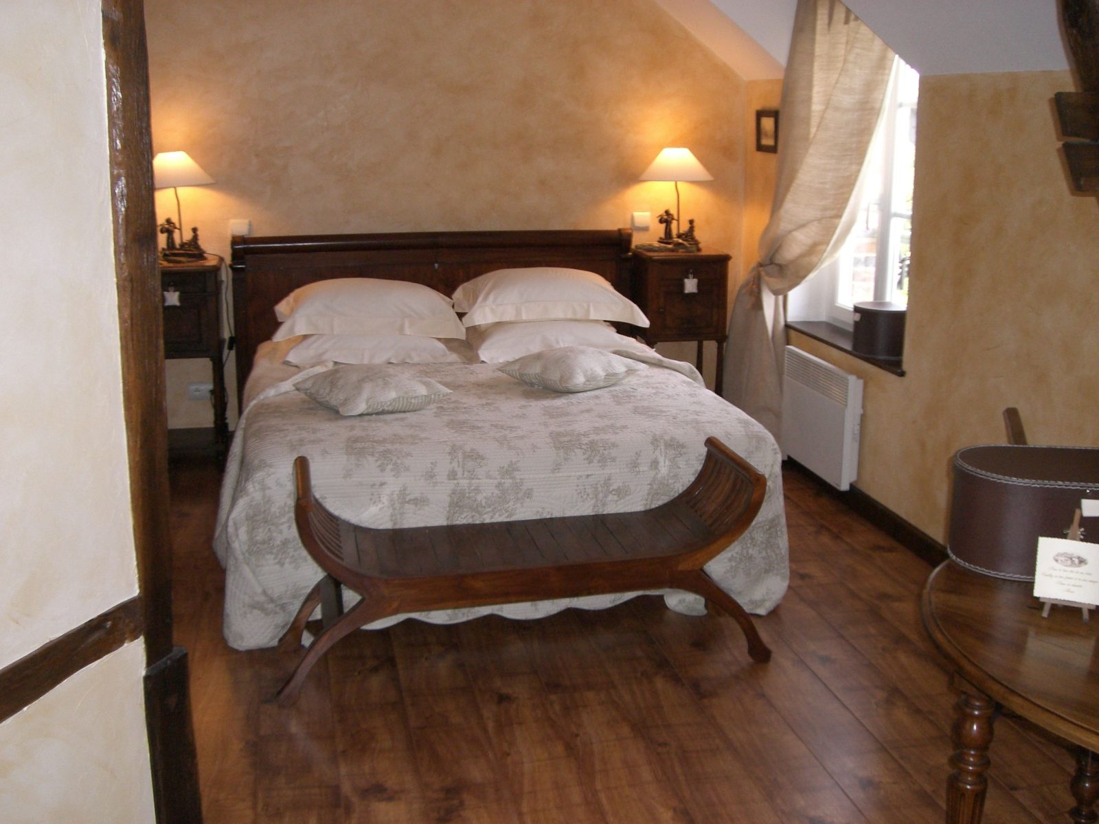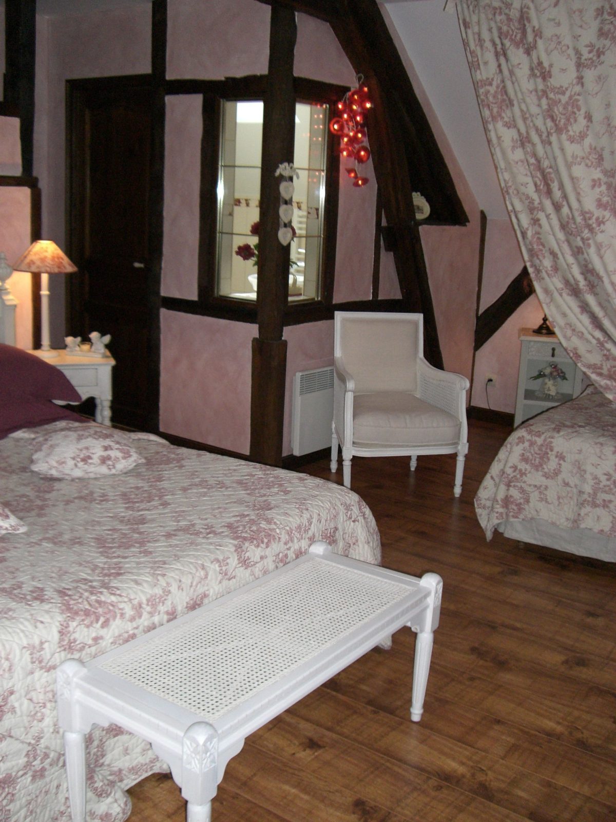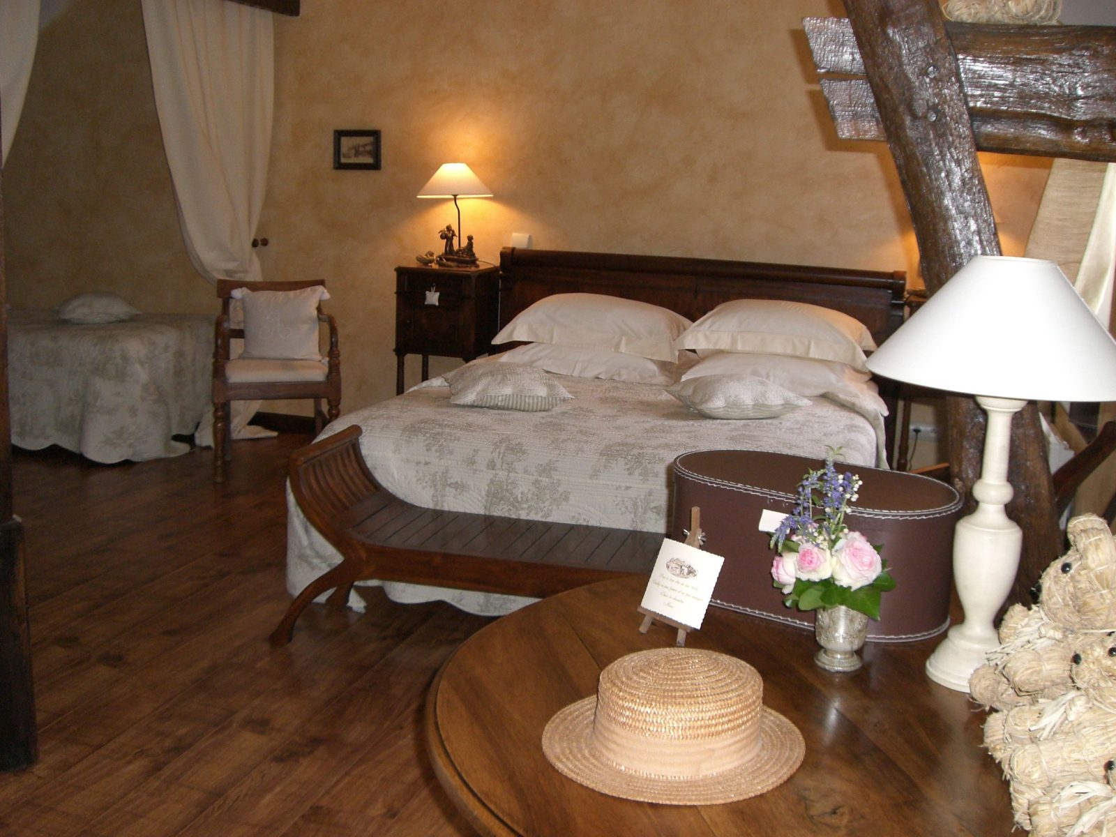 En centre-ville, à 50 m du château, dans une ancienne grange à pans de bois - Au 1er étage : 1 ch. 3 pers et 1 ch. 4 pers avec coin salon (lits 160 et 90), d'accès indépendant, toutes avec salle d'eau/wc - Au rdc : 1 ch. 2 pers (lit 160) avec salle d'eau/wc - Salle des petits déjeuners/salon réservé aux hôtes - Beau jardin arboré et fleuri avec espaces salons