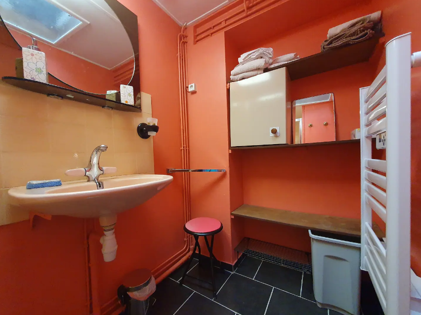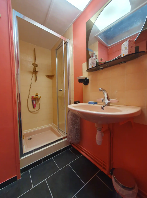 Profitez d'une salle d'eau pratique et colorée, comprenant une douche, un lavabo et des toilettes séparées. Nous fournissons les serviettes et articles de toilette essentiels pour votre confort.