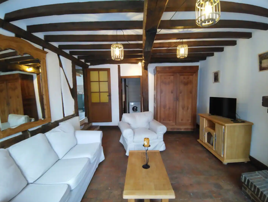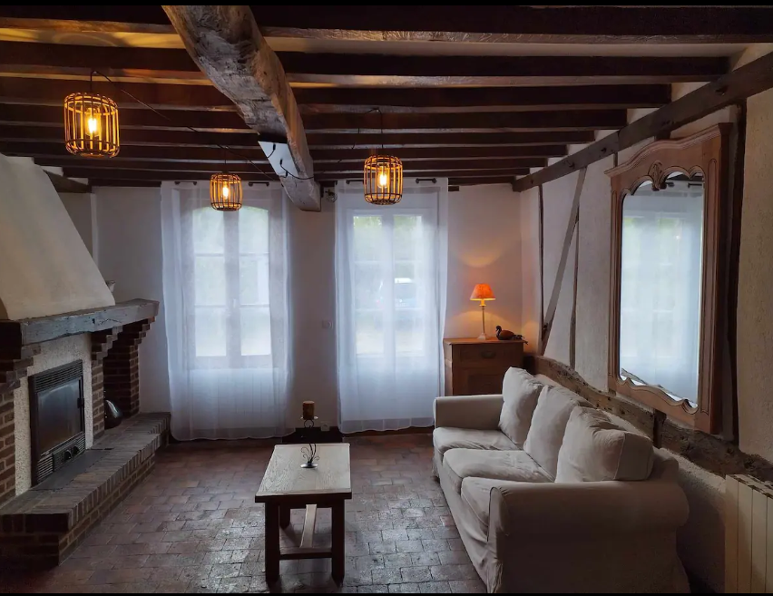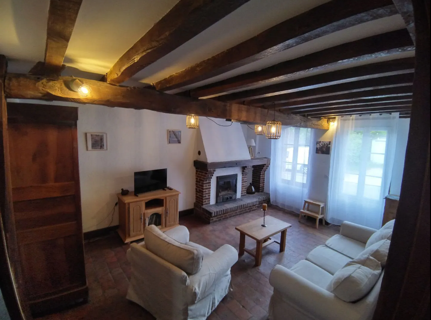Le salon, au charme typiquement solognot avec ses poutres apparentes, son sol en tomettes et sa cheminée, vous offre un cadre réconfortant pour y regarder la télévision.