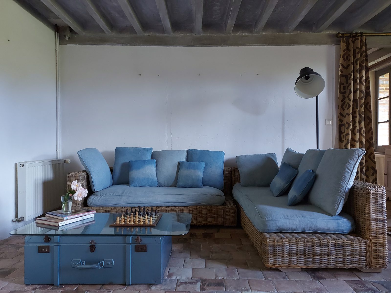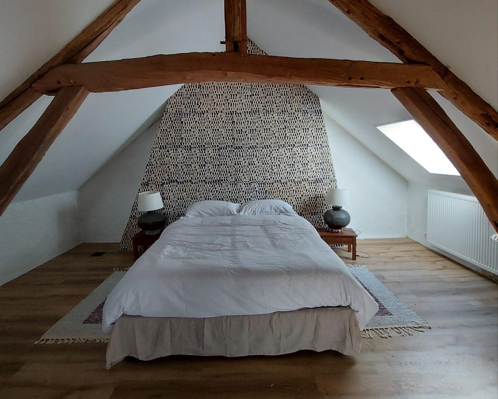 La chambre se trouve à l'étage avec un lit double de 160x200. Le palier offre un second espace nuit, composé de 2 lits de 90x200 pouvant être réunis. Les draps et les serviettes sont inclus dans la réservation, en plus du café/thé de bienvenue.