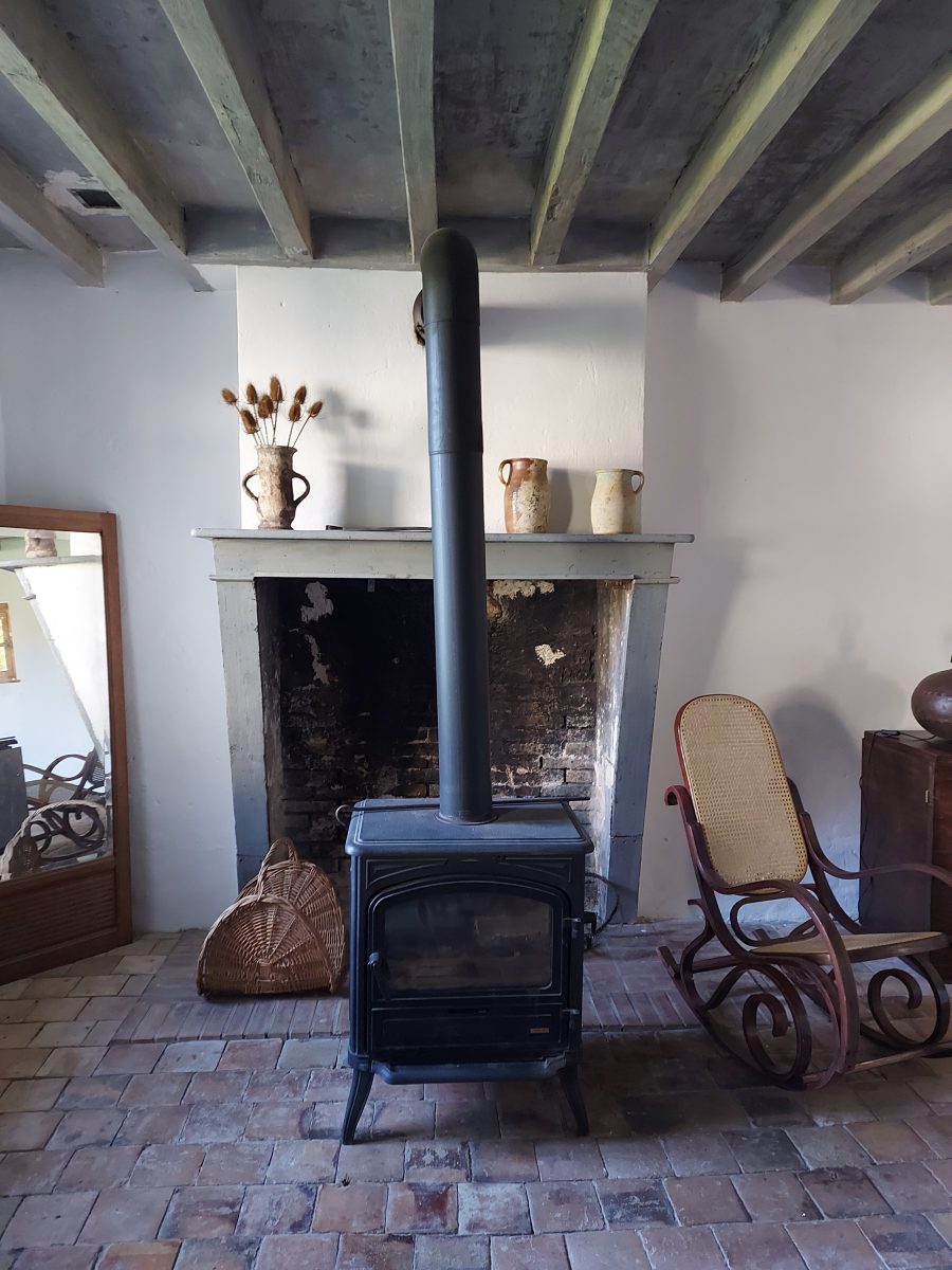 Au rez-de-chaussée, l'entrée donne accès à la cuisine et au salon avec son poêle. S'y trouve également une salle d'eau et des toilettes.
