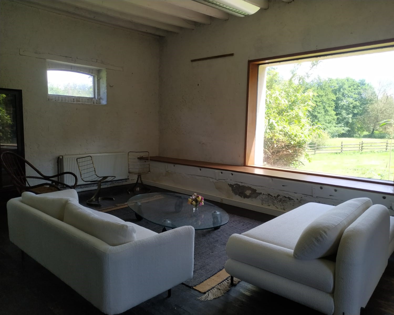 Elle se compose au rdc, d'un grand salon/salle à manger et d'une grande baie vitrée donnant sur la prairie, d'une salle de bain avec toilette et d'une cuisine.