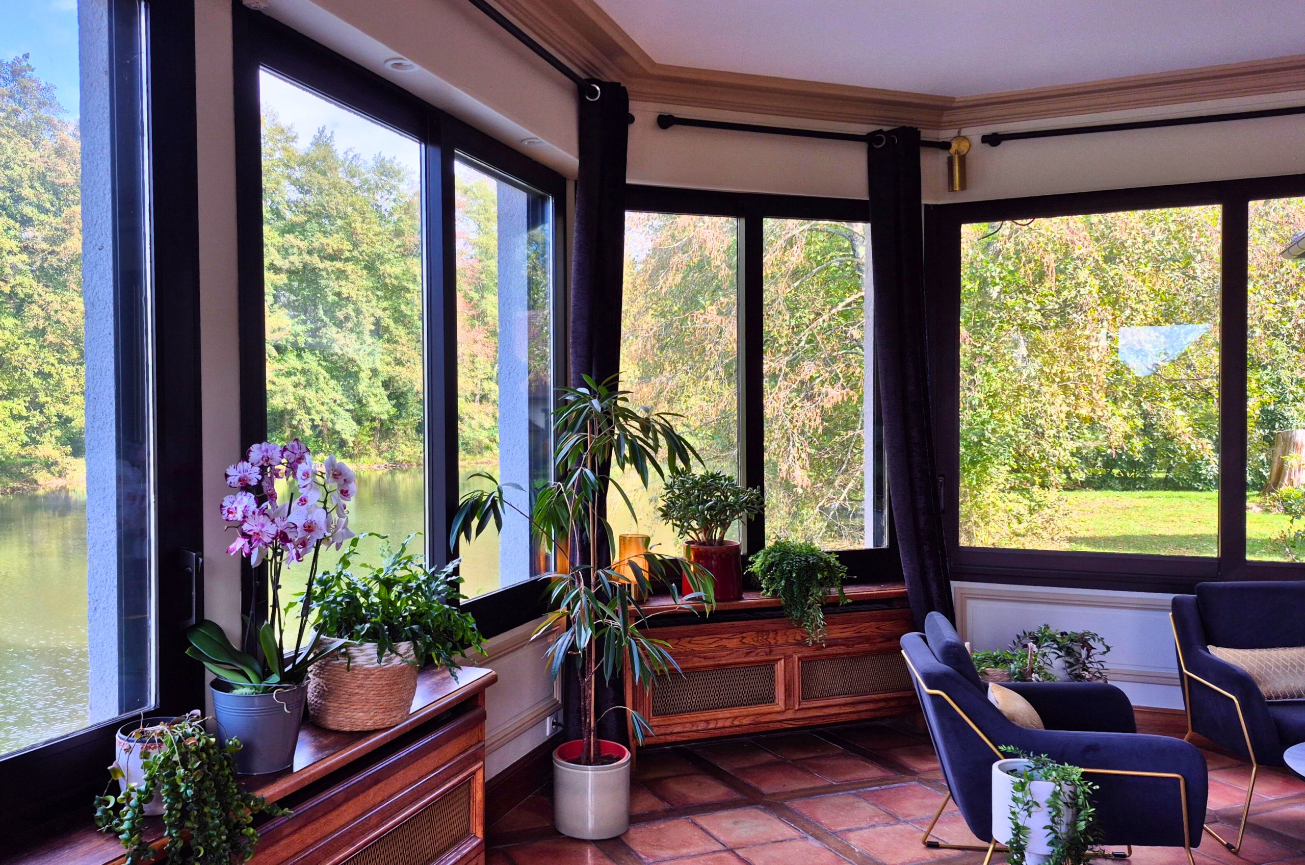 Un salon avec son bow-window – vue sur l’étang ou son coin cheminée sont à votre disposition.